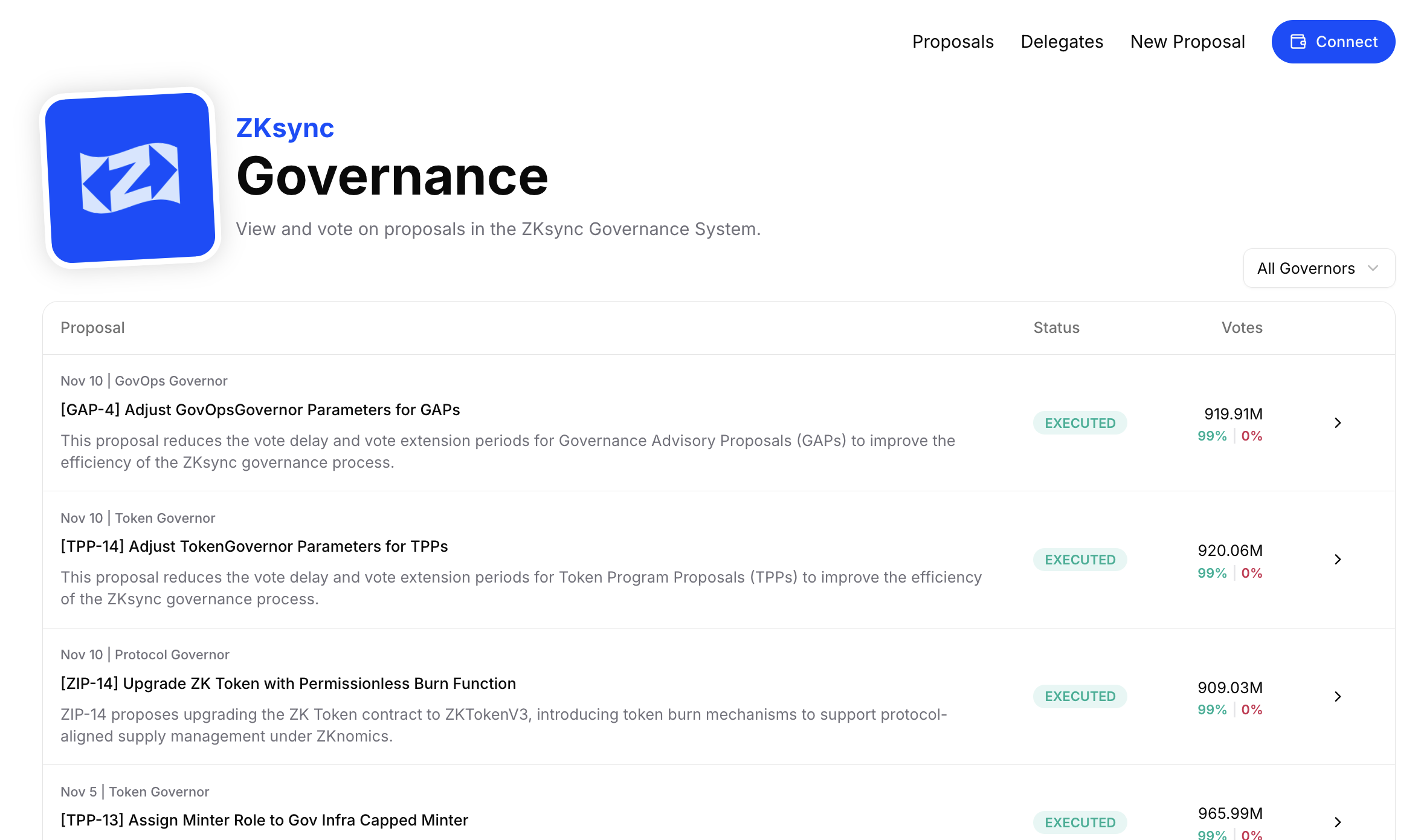 Today, a secondary governance interface for ZKsync governance goes live! alt.vote.zknation.io offers an alternative interface for Delegates & ZK token holders to delegate voting power, vote on governance proposals, and submit proposals. The interface also has a few unique features: