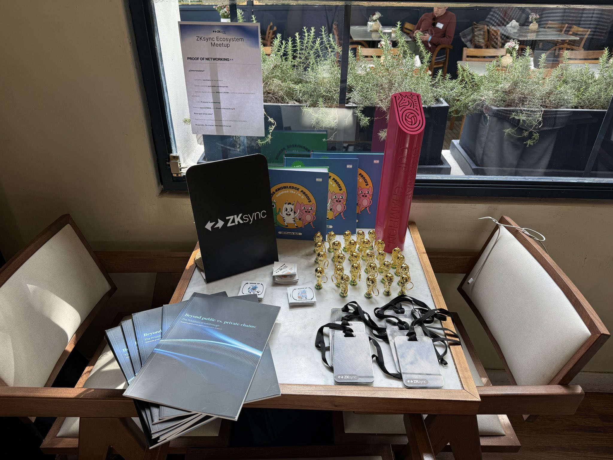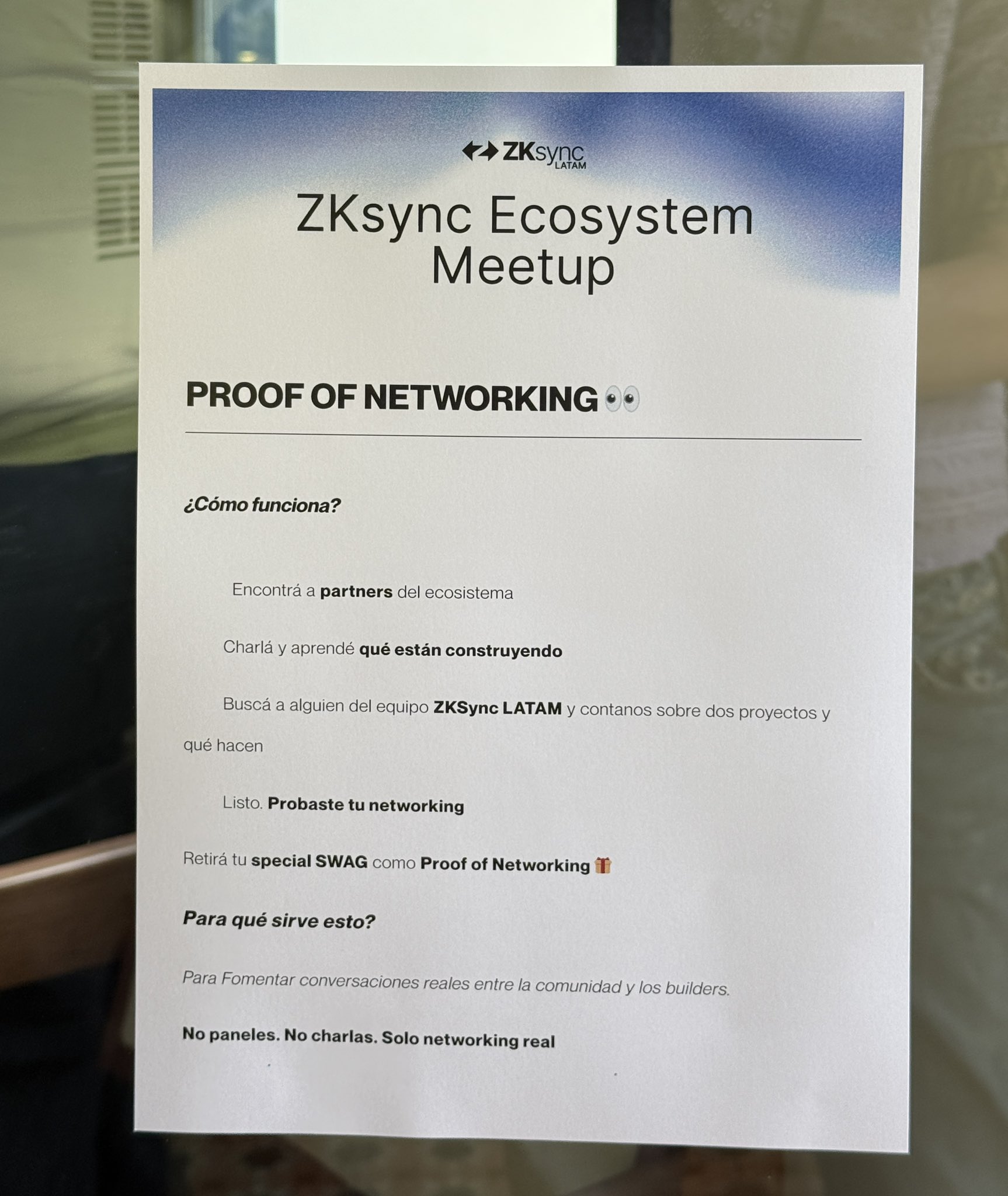 ZKsync Ecosystem meetup. Organized the official meetup from the RFP awareded. We had 8 partners, +300 inscripted and +80 attendees. Shaped as a brunch with original dynamics like “Proof of Networking” for swag awarding.