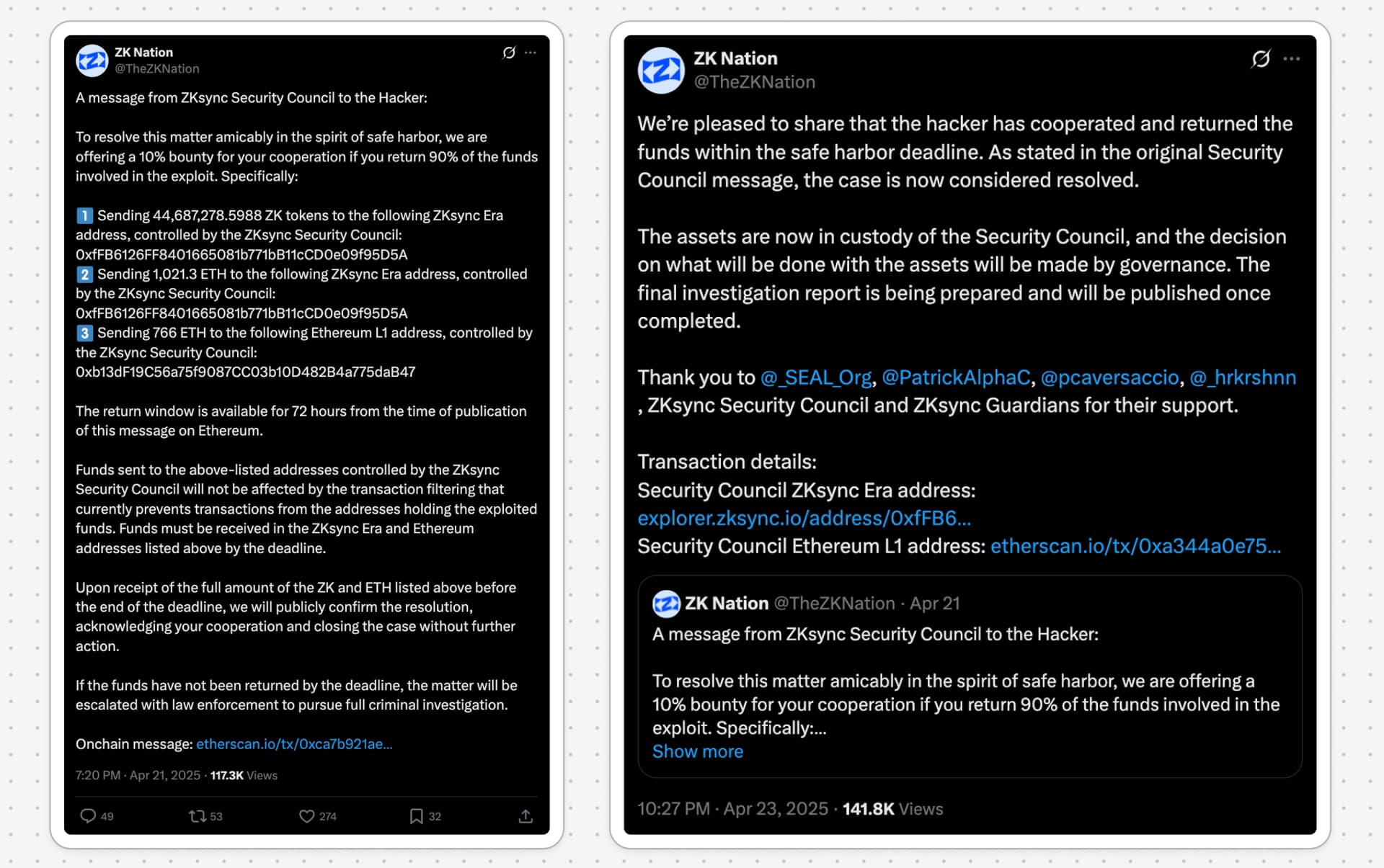 - May 2025: ZKsync X account compromise. No onchain action required; coordinated response and communication with the account owner.